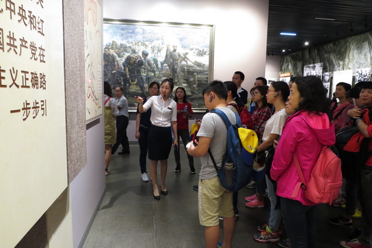 黨員在認真聽講解員講解紅軍長征過程的戰(zhàn)役