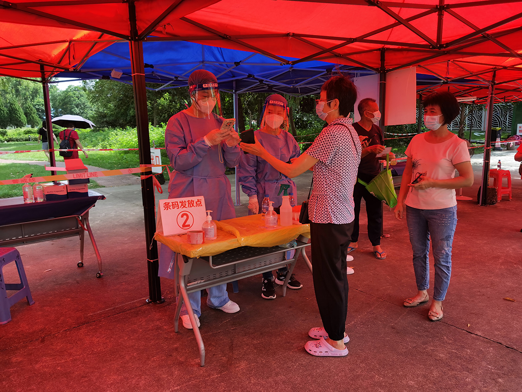 在核酸檢測現(xiàn)場,第二、三黨支部16名黨員、團員志愿者在支部書記葉萬青的帶領(lǐng)下全力支援社區(qū)開展核酸采樣工作,按照分工對參檢居民進行體溫測量、健康碼和行程碼查驗,以及維持現(xiàn)場秩序,幫助老弱病殘居民做好掃碼登記工作,協(xié)助做好各項后勤保障工作。整個過程嚴(yán)謹(jǐn)規(guī)范,現(xiàn)場秩序有條不紊。