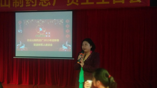 2015年2月11日,白云山制藥總廠(chǎng)在總廠(chǎng)藝術(shù)團(tuán)排練廳舉辦迎新春復(fù)退轉(zhuǎn)軍人座談會(huì)。總廠(chǎng)廠(chǎng)長(zhǎng)朱少璇、黨委書(shū)記周志魁、紀(jì)委書(shū)記、工會(huì)主席許鎮(zhèn)江出席了本次座談會(huì),與廠(chǎng)在職復(fù)退轉(zhuǎn)軍人歡聚一堂,共渡歡樂(lè)時(shí)光。座談會(huì)由總廠(chǎng)保衛(wèi)部部長(zhǎng)謝秋生主持。
