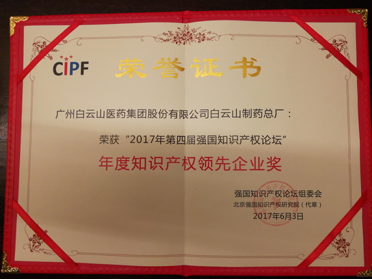 2017年6月3日,“2017第四屆強國知識產(chǎn)權(quán)論壇”在北京盛大召開,白云山總廠獲得“年度知識產(chǎn)權(quán)領(lǐng)先企業(yè)”榮譽稱號??倧S法務(wù)總監(jiān)許淑文代表企業(yè)參會并領(lǐng)獎。
