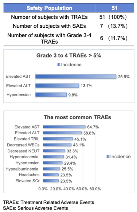 所有受試者均出現(xiàn)治療相關不良事件(TRAE),最常見的TRAE為AST升高(64.7%)、ALT升高(58.8%)、TBIL升高(45.1%)、WBC降低(43.1%)、NEUT降低(33.3%)、高尿酸血癥(31.4%)、高血壓(29.4%)、低白蛋白血癥(25.5%)、SCr升高(23.5%)和頭痛(23.5%)[1]。