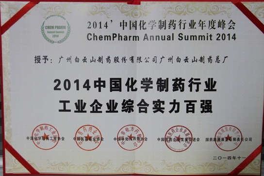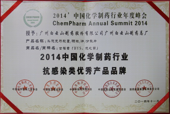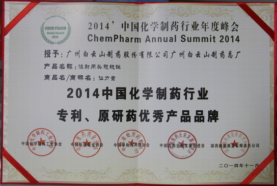 2014年11月26日,由中國(guó)化學(xué)制藥工業(yè)協(xié)會(huì)、中國(guó)醫(yī)藥商業(yè)協(xié)會(huì)、中國(guó)非處方藥物協(xié)會(huì)、中國(guó)醫(yī)藥企業(yè)發(fā)展促進(jìn)會(huì)共同主辦的2014’中國(guó)化學(xué)制藥行業(yè)年度峰會(huì)在廣州舉行。大會(huì)以“質(zhì)量、誠(chéng)信、品牌”為主題,國(guó)家食藥監(jiān)局稽查局副局長(zhǎng)邢勇、工信部信息化推進(jìn)司王建偉處長(zhǎng)等政府領(lǐng)導(dǎo)和專家出席并作主題演講,并發(fā)布優(yōu)秀企業(yè)和優(yōu)秀產(chǎn)品品牌榜。廣州白云山制藥總廠被授予“2014’中國(guó)化學(xué)制藥行業(yè)工業(yè)企業(yè)綜合實(shí)力百?gòu)?qiáng)”,主打產(chǎn)品注射用頭孢硫脒(仙力素)獲“2014’中國(guó)化學(xué)制藥行業(yè)專利、原研藥優(yōu)秀產(chǎn)品品牌”,頭孢克肟(世福素)、阿莫西林膠囊/顆粒共同獲“2014’中國(guó)化學(xué)制藥行業(yè)抗感染類優(yōu)秀產(chǎn)品品牌”。廣州白云山總廠副廠長(zhǎng)鄭麗真代表企業(yè)參會(huì)并上臺(tái)授獎(jiǎng)。