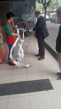 2月3日上午,檢查小組首先對(duì)市區(qū)內(nèi)的多寶路72、74號(hào)、多寶酒店、和平西路及芳村廠區(qū)等出租物業(yè)進(jìn)行檢查,特別對(duì)上次檢查中指出的需要整改的問題進(jìn)行了重點(diǎn)檢查。在多寶酒店分租點(diǎn)老百姓藥房,檢查組發(fā)現(xiàn)其倉庫的貨架上有電線與貨物混雜在一起,存在重大安全隱患,令其立刻現(xiàn)場(chǎng)整改同時(shí)對(duì)其店長及多寶酒店主管進(jìn)行了嚴(yán)肅的教育。此后,檢查組陸續(xù)發(fā)現(xiàn)多個(gè)消防安全隱患,都一一進(jìn)行了登記并提出整改方案要求各租戶及時(shí)整改。